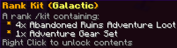 Rank Kits are kits that you get with your current rank! Rank Kits consist of | Rank Kits are kits that you get with your current rank! Rank Kits consist of an armor set (tiered to your adventure map unlock), tools, and some goodies! | ||