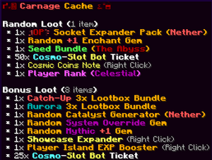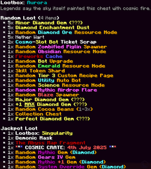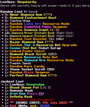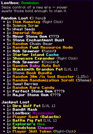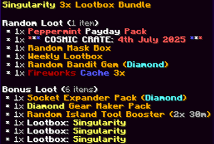 Lootboxes are special boxes with items that change weekly and are available for purchase in the store during weekends. Hovering over a Lootbox reveals its contents, which are divided into three categories: Random Loot, Jackpot Loot, and Bonus Loot. Random Loot includes a variety of items depending on the Lootbox theme. Jackpot Loot features rare and exclusive top-tier items, while Bonus Loot adds cosmetic rewards for extra flair. To open a Lootbox, simply right-click on it. Once opened, you will receive random items from its list, and all rolled items are automatically added to your inventory for use.