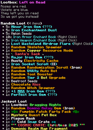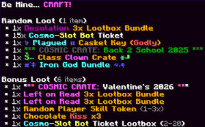 Lootboxes are special boxes with items that change weekly and are available for purchase in the store during weekends. Hovering over a Lootbox reveals its contents, which are divided into three categories: Random Loot, Jackpot Loot, and Bonus Loot. Random Loot includes a variety of items depending on the Lootbox theme. Jackpot Loot features rare and exclusive top-tier items, while Bonus Loot adds cosmetic rewards for extra flair. To open a Lootbox, simply right-click on it. Once opened, you will receive random items from its list, and all rolled items are automatically added to your inventory for use.